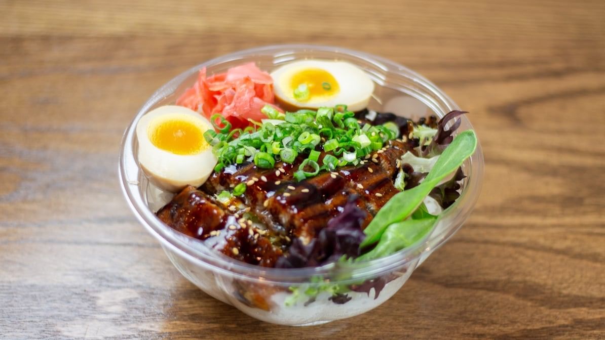 The unique flavoring of sweet and salty Unadon Eel on a bed of rice partnered with Japanese Ginger, soft boiled egg, and spring mix salad