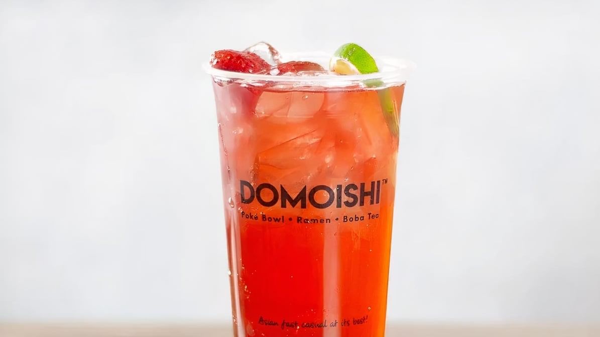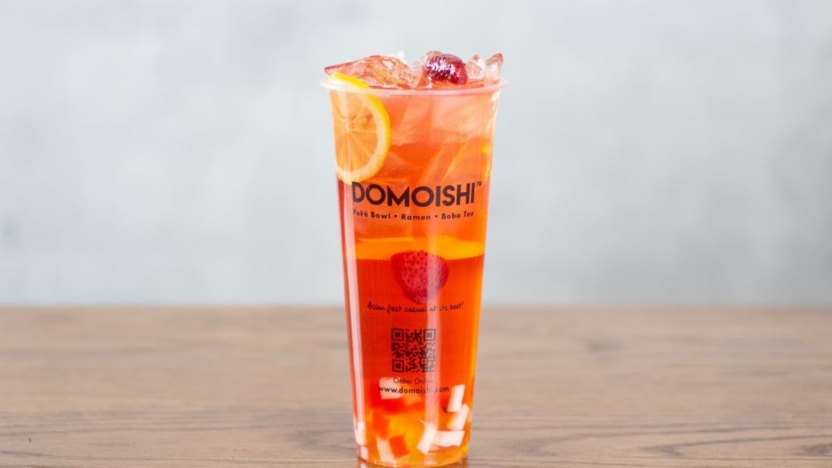 Infused fruit hibiscus tea flavored with a blend of apples, blueberries and rose hips, served with a slice of lemon, and a strawberry over ice. Always crafted with fresh brewed premium Domoishi blended Fantasy Berry tea